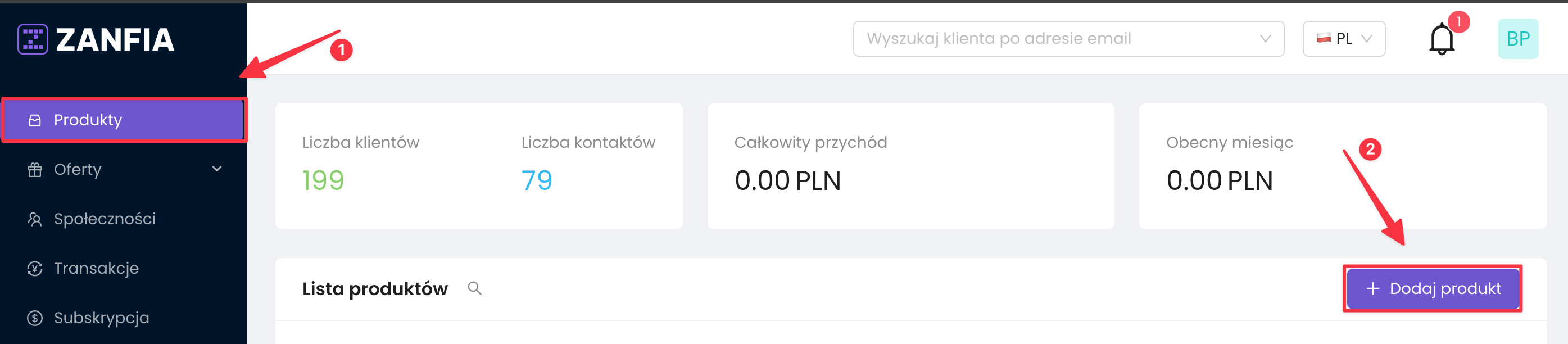Kliknij Dodaj pierwszy produkt (lub + Dodaj produkt, jeśli masz już inne produkty).
