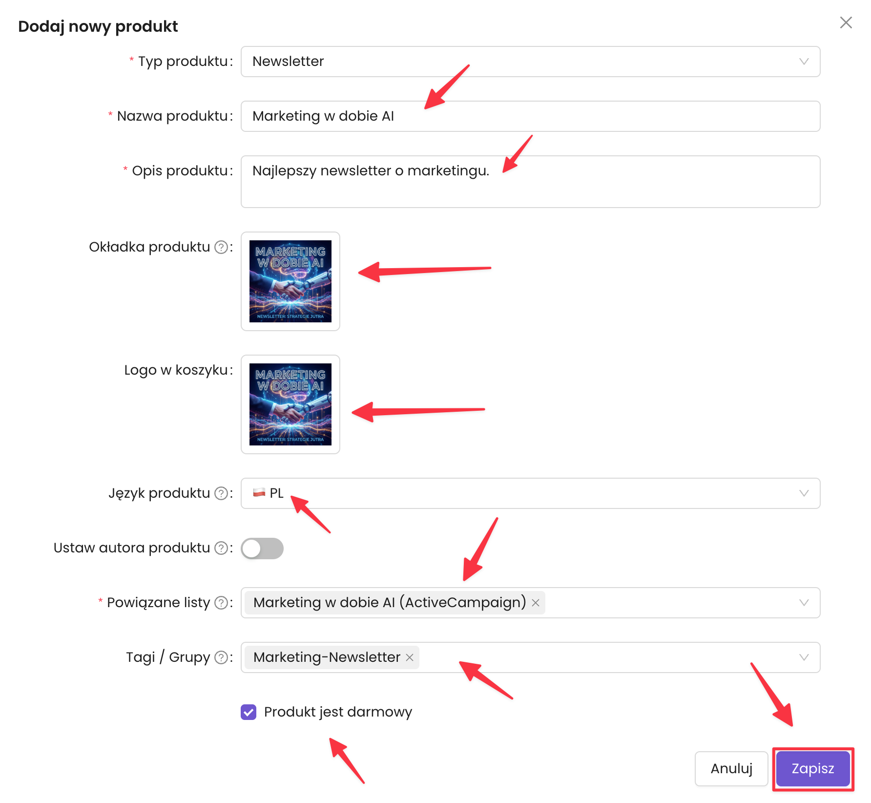 | Nazwa produktu | nazwa widoczna dla subskrybentów (np. „Jak tworzyć dobry newsletter?”) |