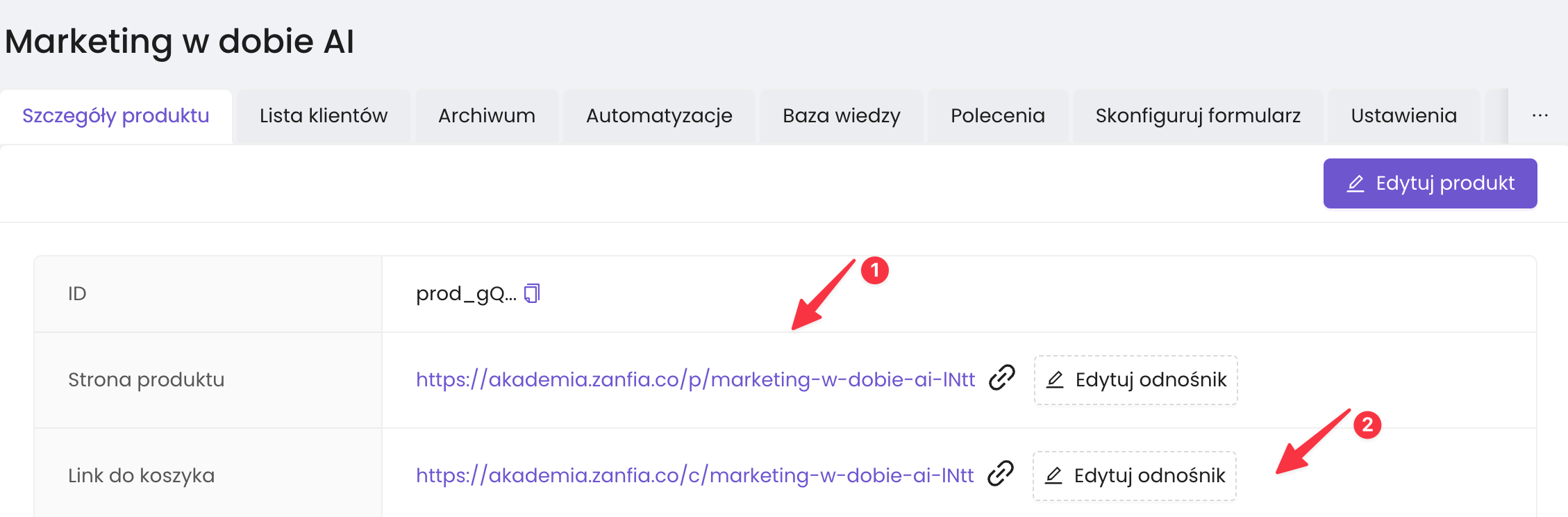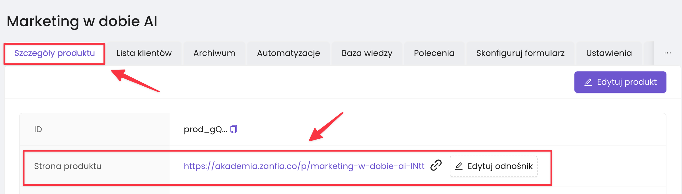Zanfia automatycznie tworzy stronę produktu, którą możesz udostępniać. Aby ją skonfigurować: