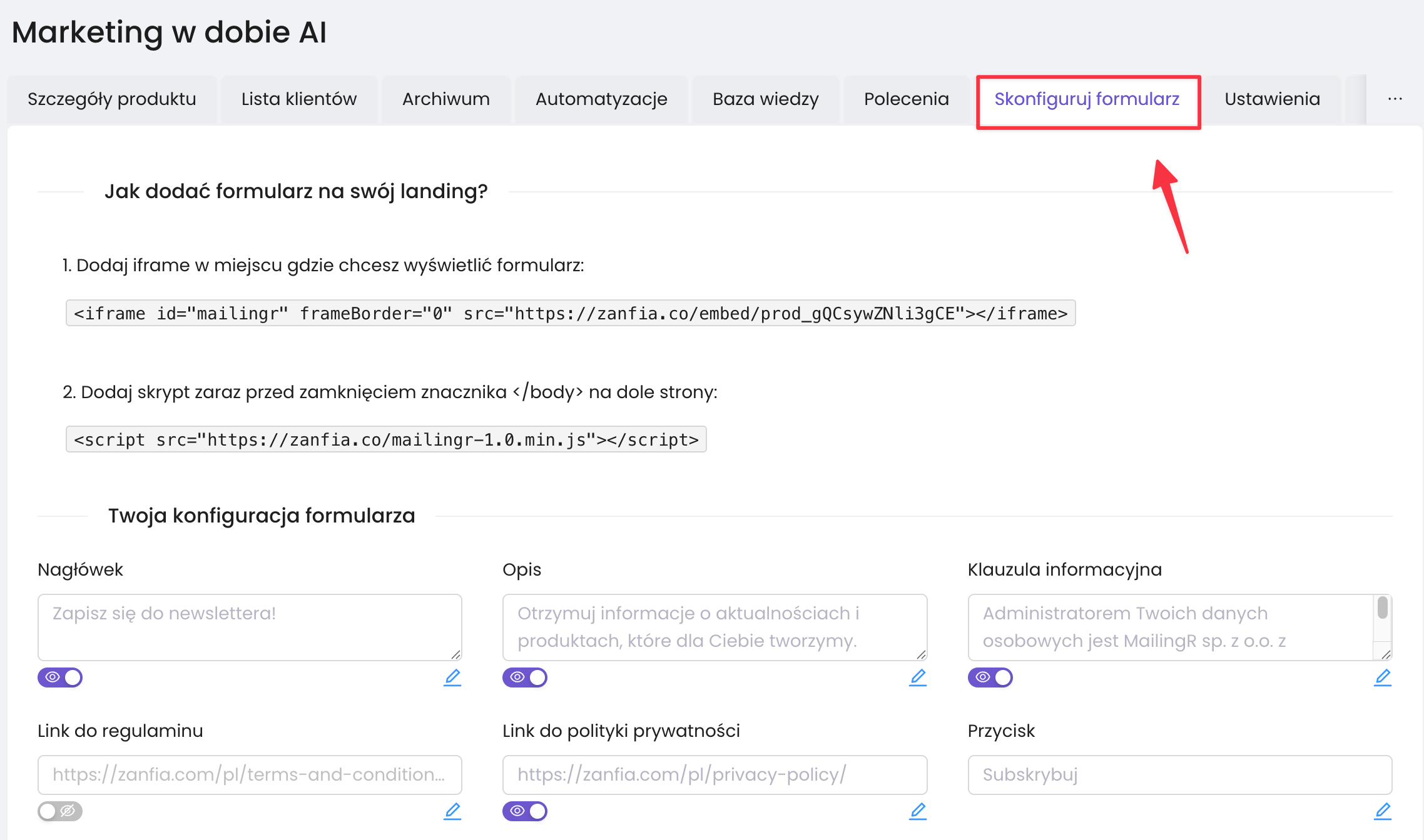 W sekcji „Jak dodać formularz na swój landing?” znajdziesz: