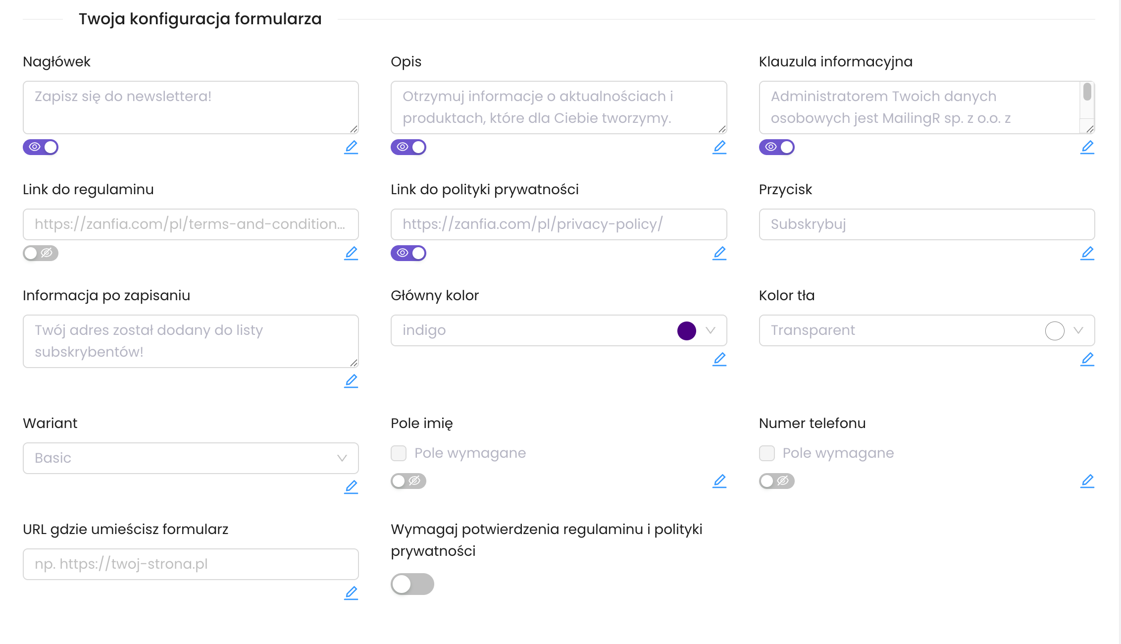W zakładce Skonfiguruj formularz możesz edytować każdy element: