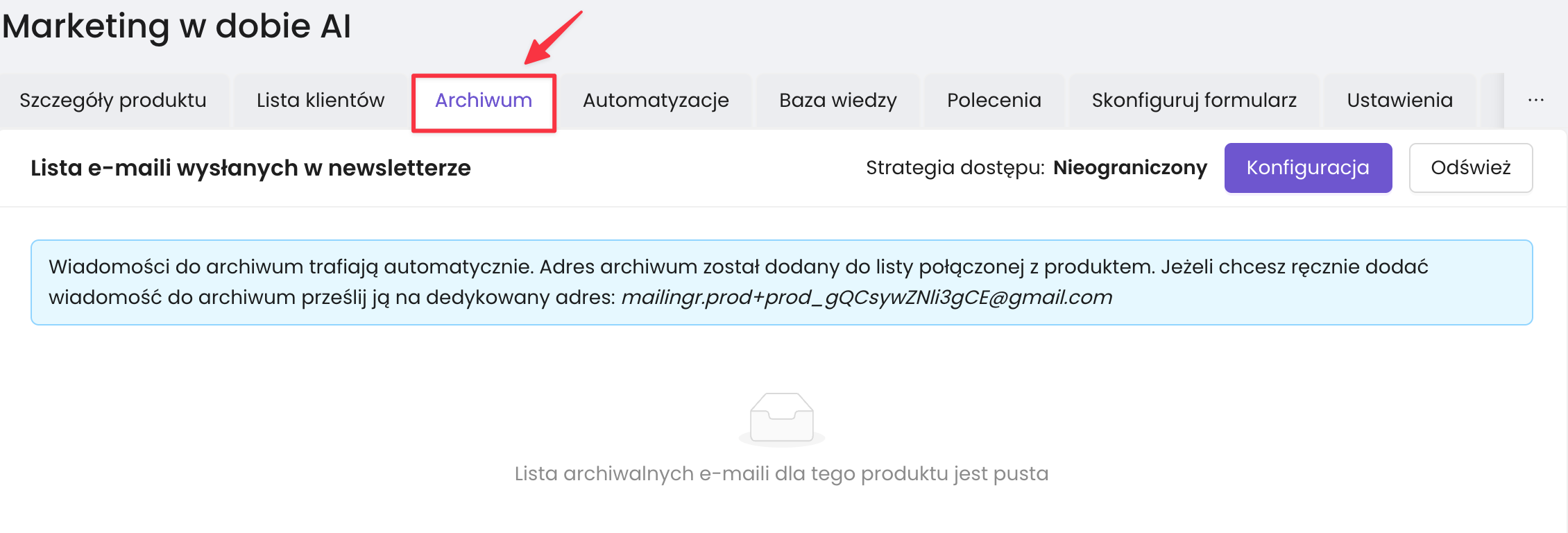 Archiwum to miejsce, gdzie znajdziesz wszystkie wysłane wiadomości. Przejdź do Szczegóły produktu → Archiwum.