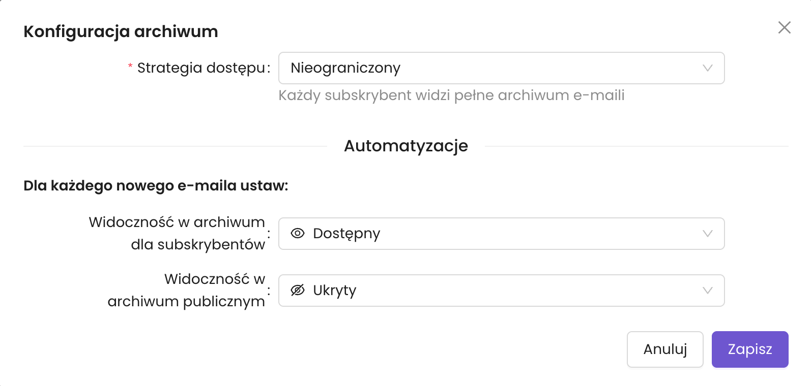 | Widoczność dla subskrybentów | domyślna widoczność nowych maili dla zalogowanych (tryb dostępny) |