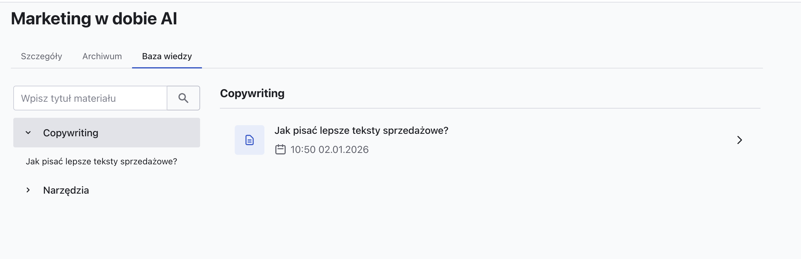 Materiały możesz organizować w kategorie (np. „Copywriting”, „Narzędzia”).