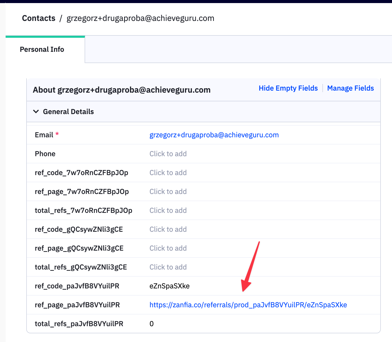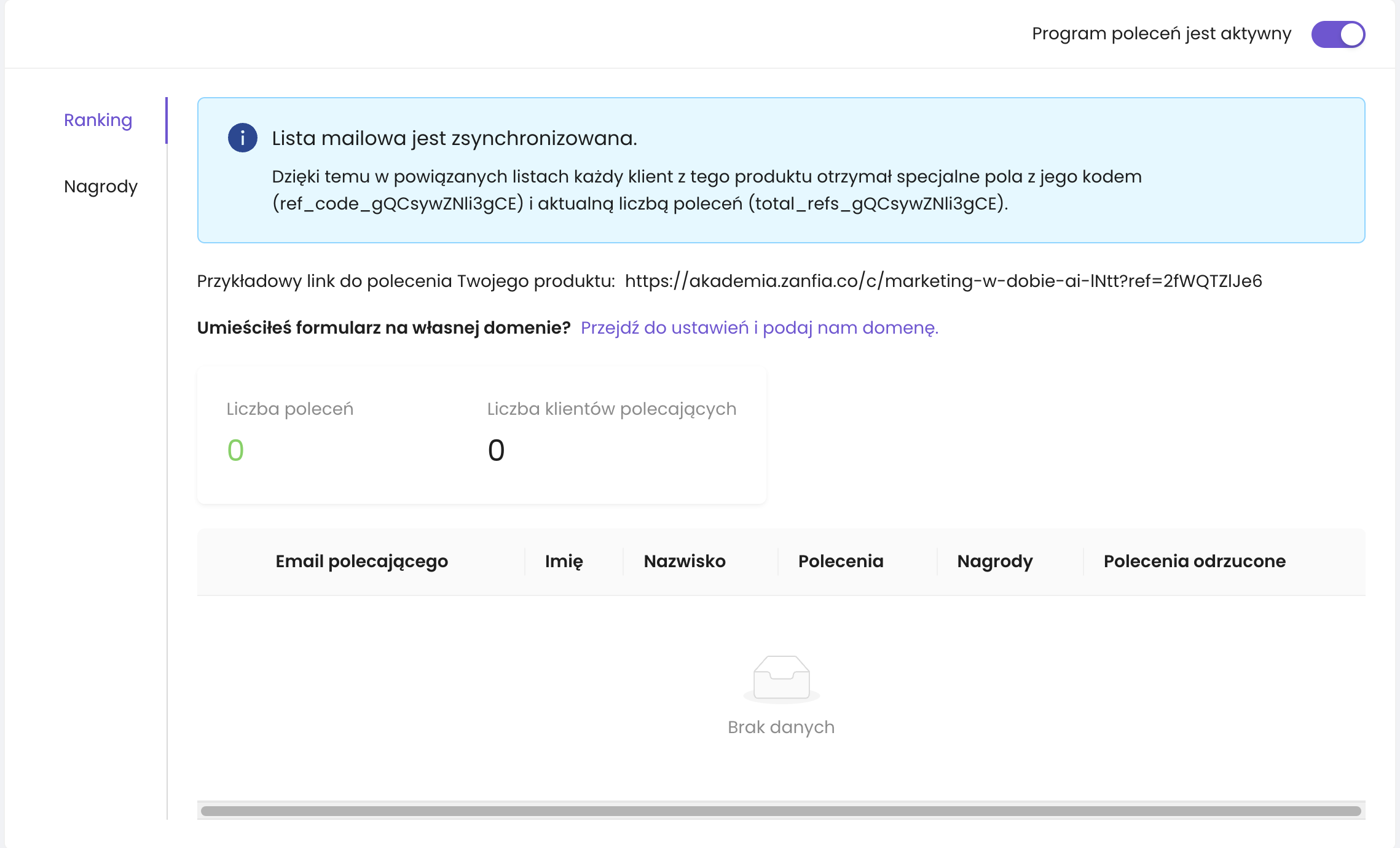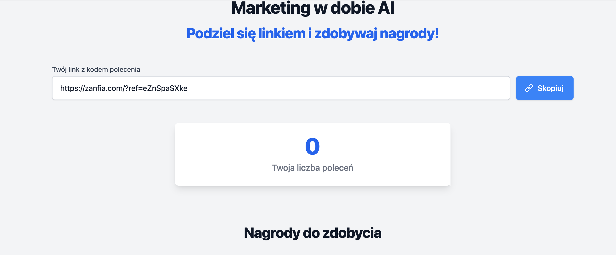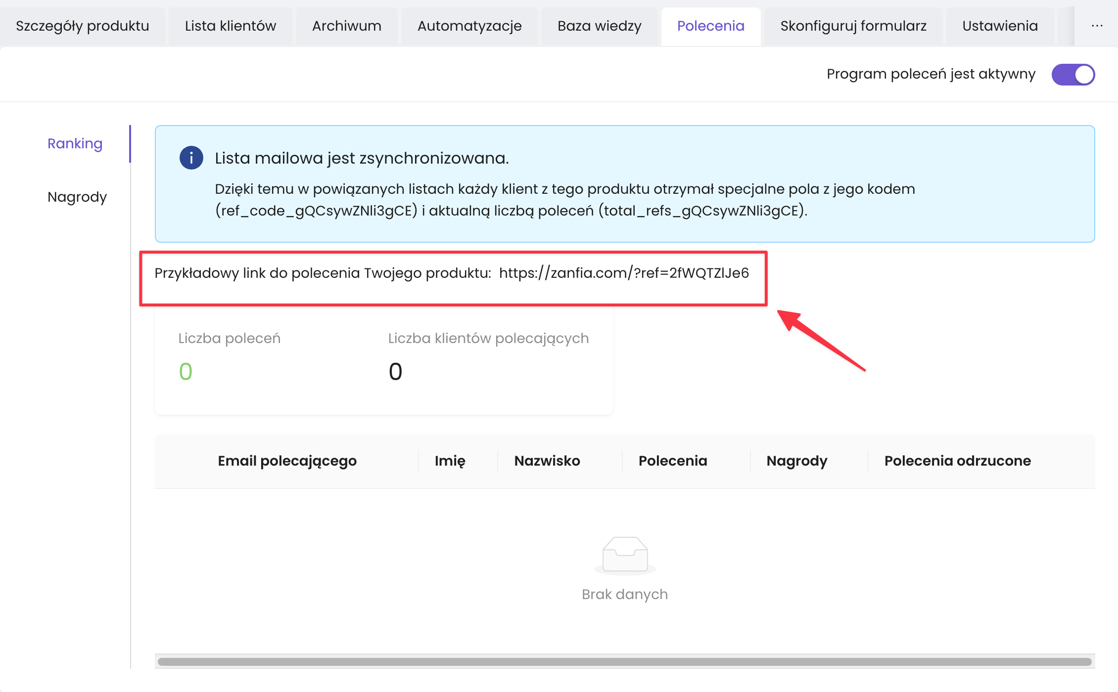 Po dodaniu Nagrody możesz przejść do swojego systemu mailowego i zobaczyć Referral Link. To indywidualny link wygenerowany dla tego użytkownika.