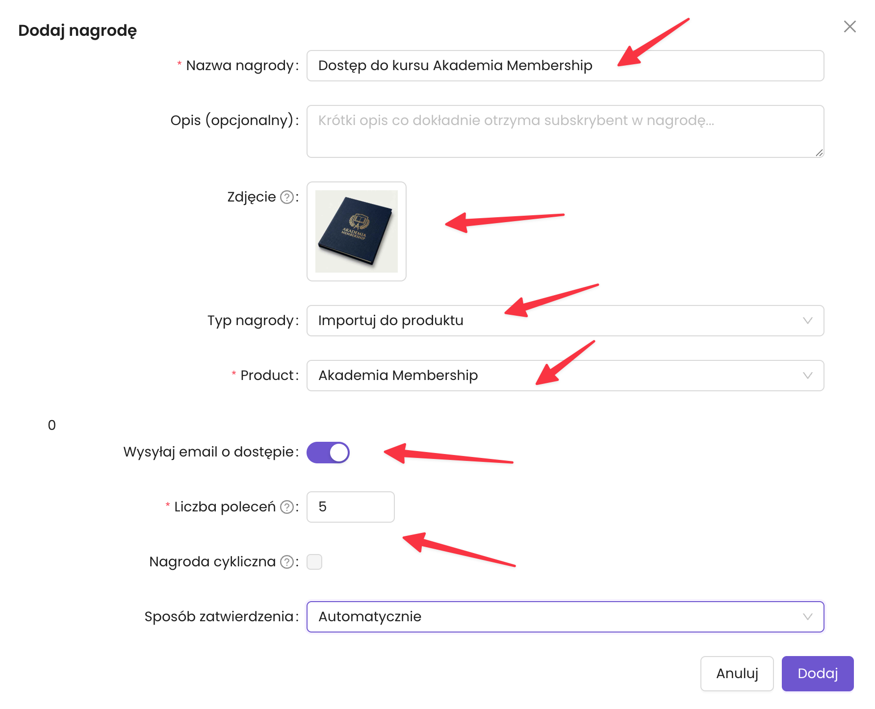 | Opis (opcjonalny) | możesz przygotować krótki opis nagrody |