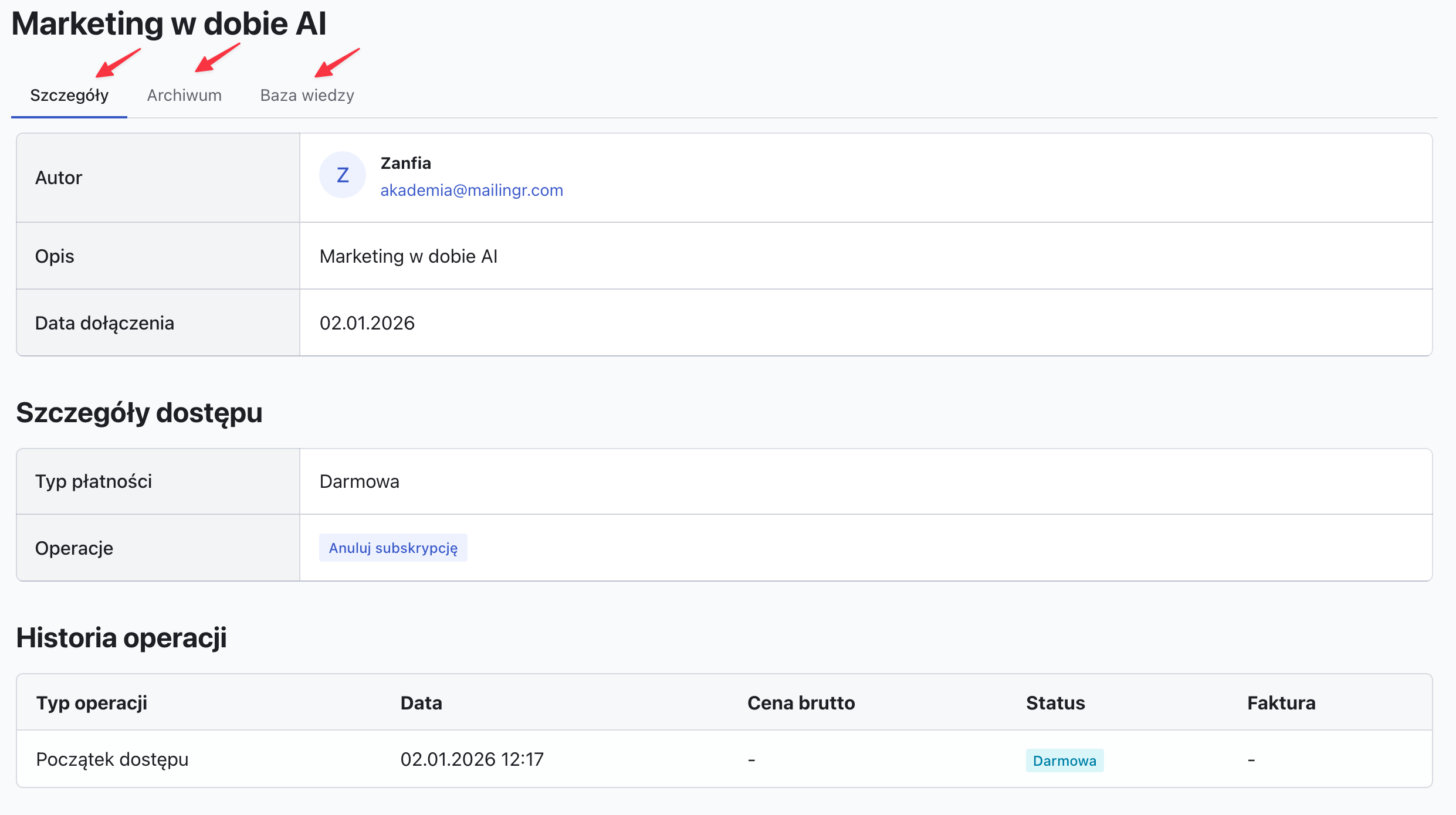 Baza wiedzy pozwala udostępniać subskrybentom dodatkowe materiały (pliki PDF, instrukcje, zadania).
