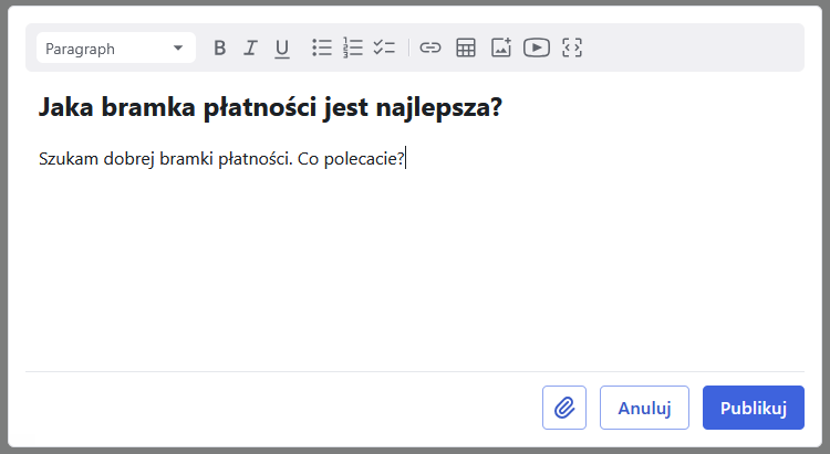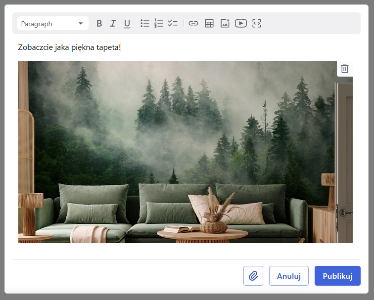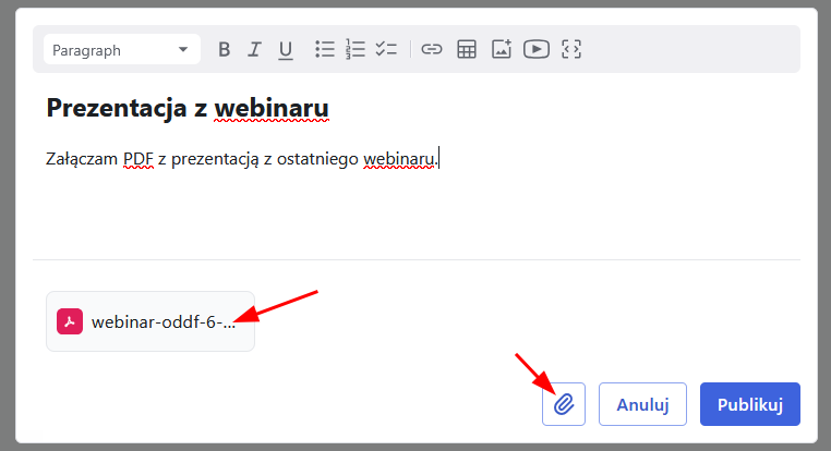 Aby dodać załącznik do posta kliknij ikonę spinacza i wybierz plik, który chcesz załączyć.