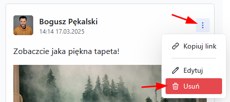 Aby edytować treść posta kliknij ikonę kropek w prawym górnym rogu posta i wybierz „Edytuj”.