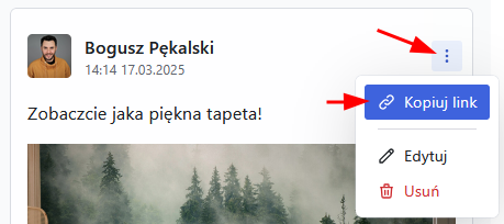Jeżeli chcesz skopiować bezpośredni link do posta kliknij ikonę kropek w prawym górnym rogu posta i wybierz „Kopiuj link”.
