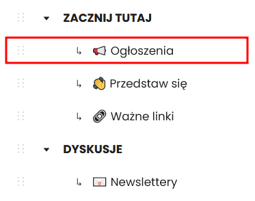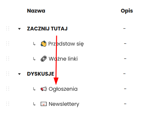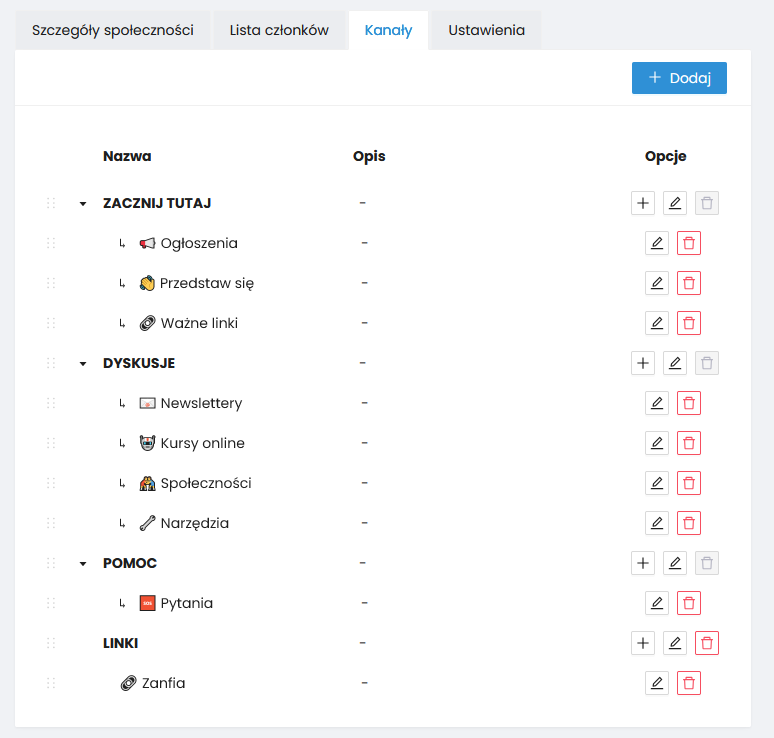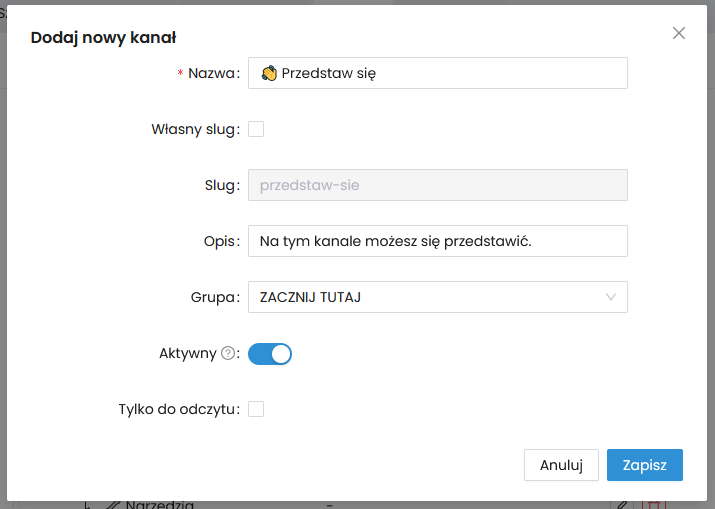 - Aktywny – aktywne kanały widoczne są dla wszystkich członków społeczności, nieaktywne tylko dla administratorów