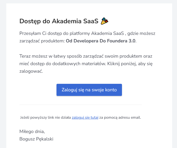 Kiedy zaimportujesz klienta do produktu (z wybraną opcją wysłania maila o dostępie) klient otrzyma powiadomienie e-mail z informacją i linkiem do zalogowania się na swoje konto.