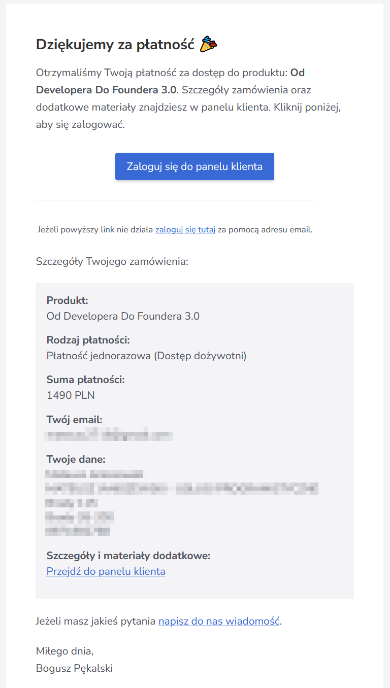 Po zakupie produktu klient otrzyma powiadomienie e-mail z potwierdzeniem transakcji i linkiem do zalogowania się na swoje konto.