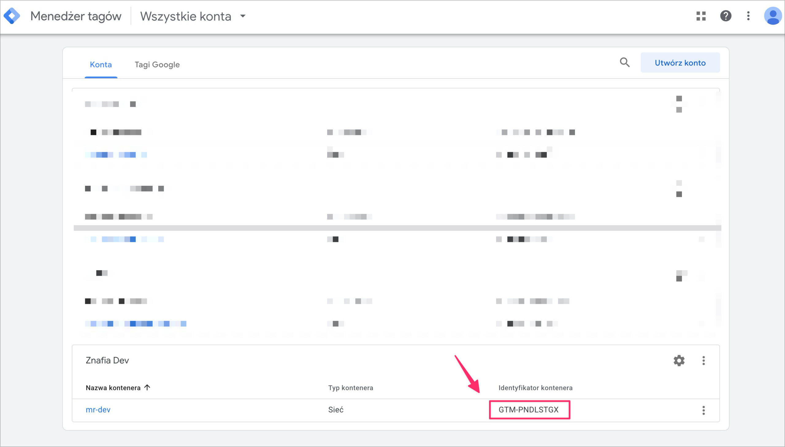Następnie wybieramy konto, które chcemy połączyć i kopiujemy Identyfikator kontenera.