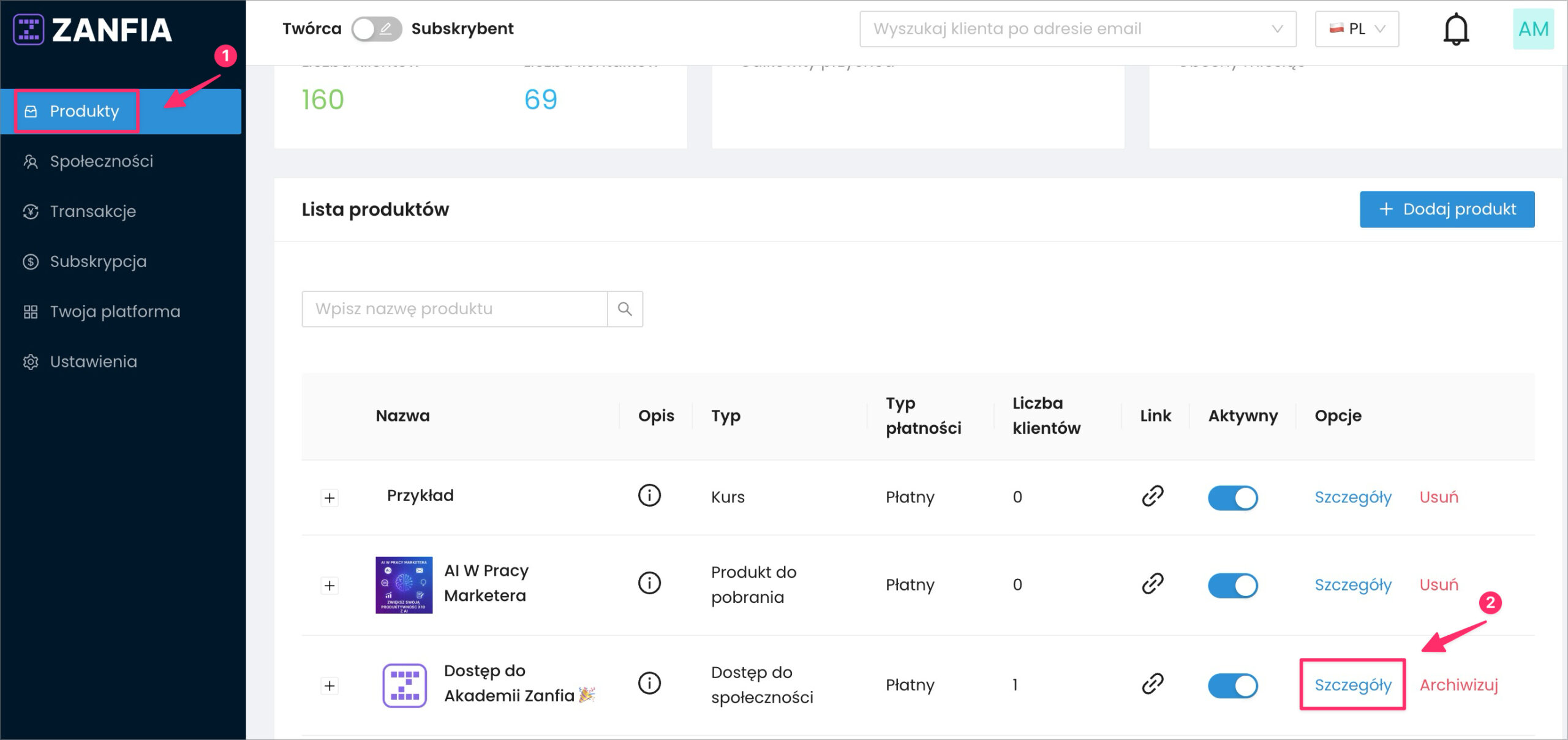 W panelu Zanfia przejdź do zakładki Produkty i kliknij Szczegóły przy wybranym produkcie