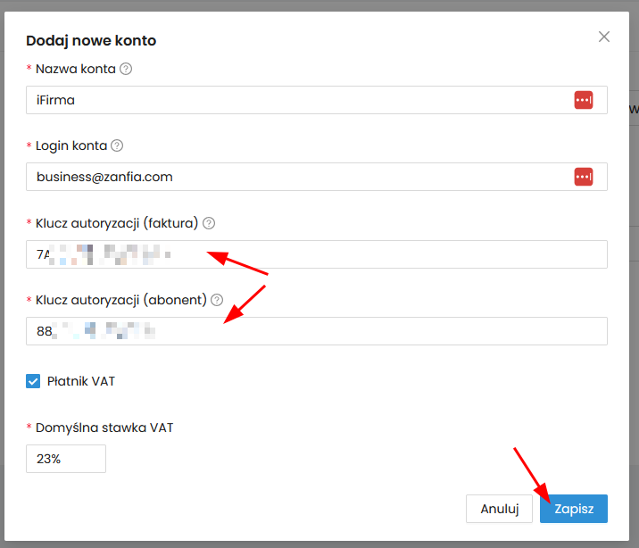 - Klucz autoryzacji (faktura)