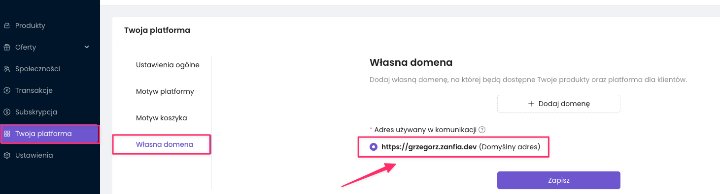 - Przejdź na moment do panelu Zanfii do sekcji Ustawienia -> Własna domena.