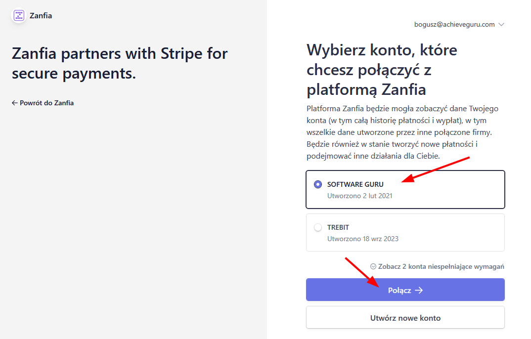 3. Wybierz konto Stripe, które chcesz połączyć z Zanfią.