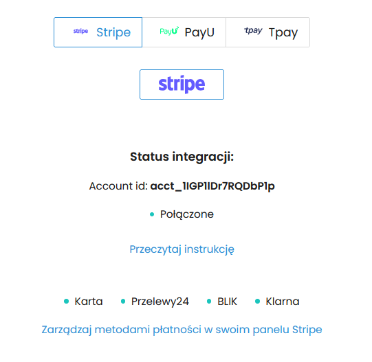 1. Przejdź do Ustawienia -> Bramki płatności -> Stripe.