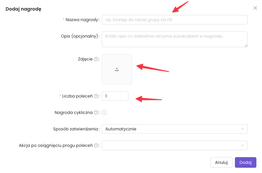 Nazwa nagrody → np. „Ekskluzywny e-book” lub „Dostęp do prywatnego wideo”