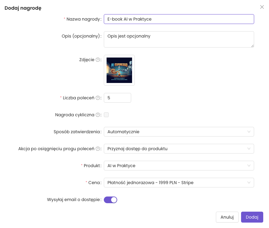 Opis nagrody → krótki opis tego, co otrzyma polecający