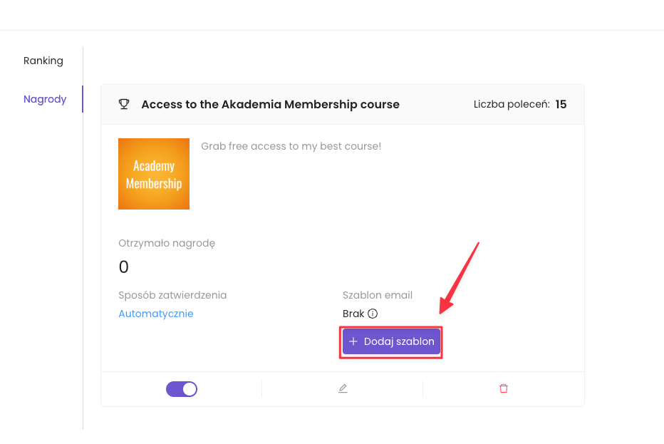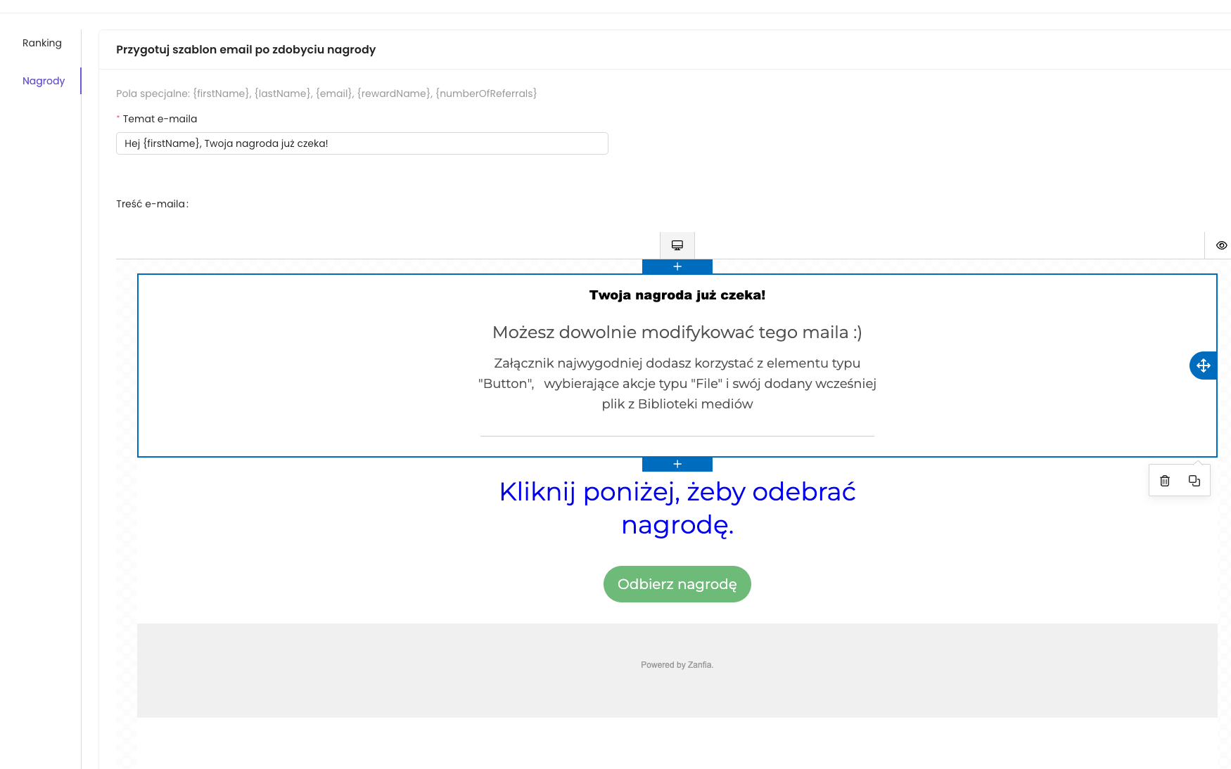 Po dodaniu nagrody kliknij Edytuj szablon e-mail.