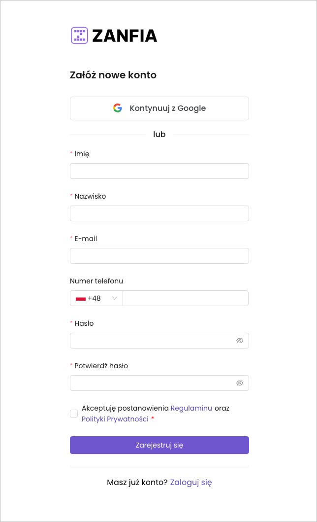 Wejdź na stronę https://app.zanfia.com/auth/register i zarejestruj nowe konto twórcy.