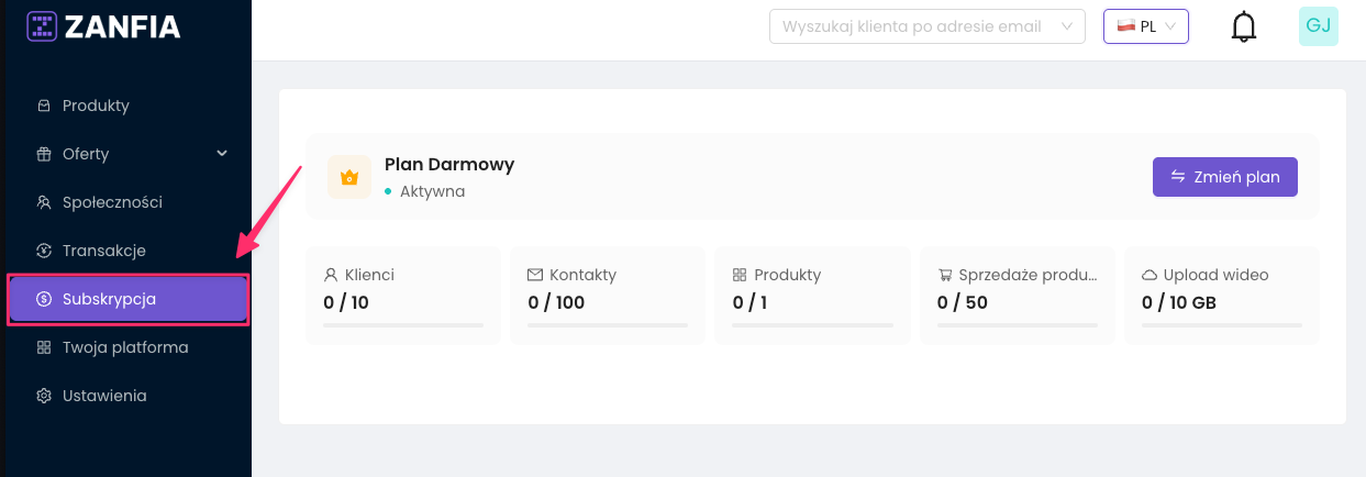 W panelu aplikacji znajdź i kliknij zakładkę SUBSKRYPCJA.