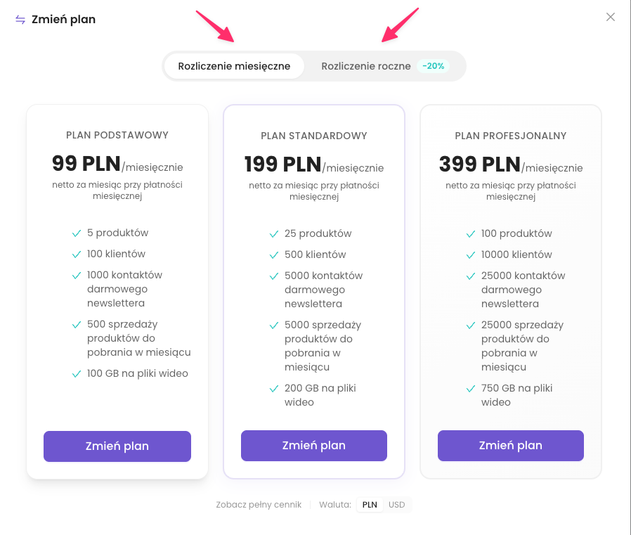 Wybierz odpowiedni plan dla siebie, możesz wybrać rozliczenie miesięczne lub rozliczenie roczne i zaszędzić 20% na subskrypcji.