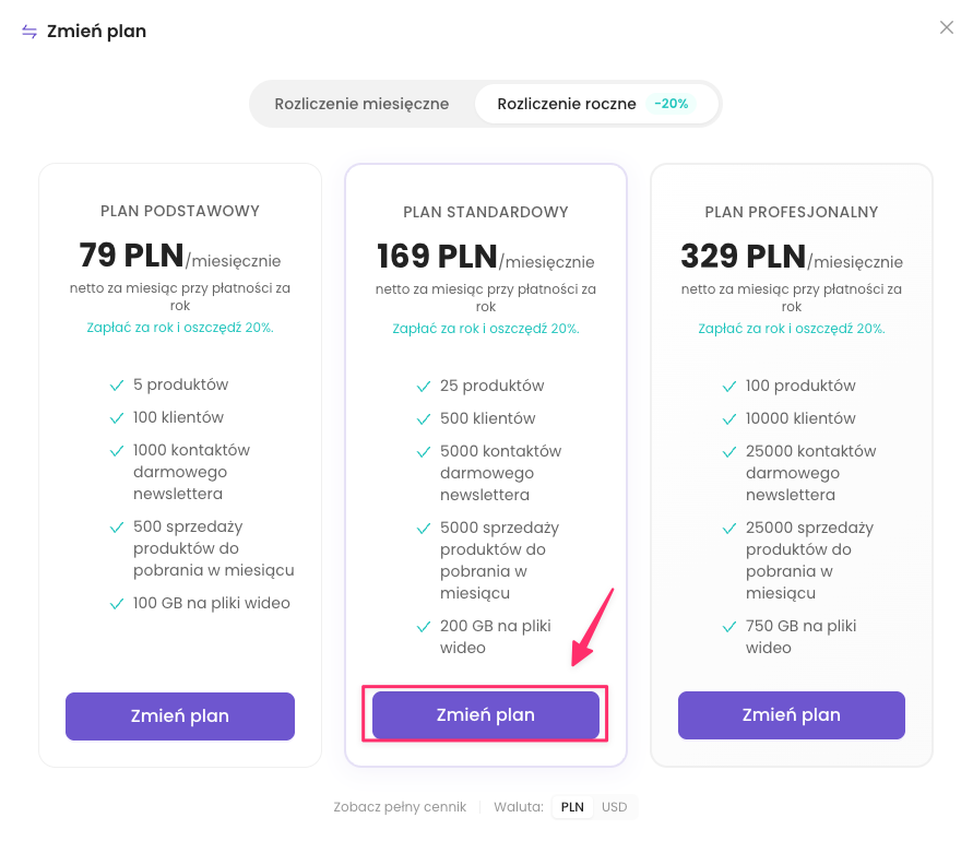 Krok 4: Wybierz odpowiedni plan dla siebie i kliknij “Zmień plan”. #