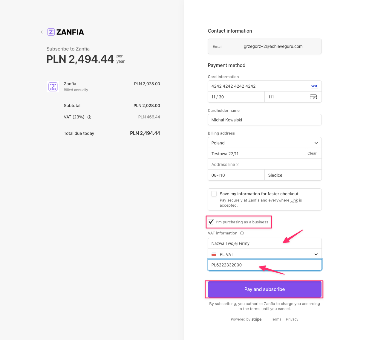 Po podaniu wszystkich danych kliknij “Pay and subscribe”