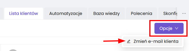 2. Otwórz menu „Opcje” i wybierz Zmień e-mail klienta. #