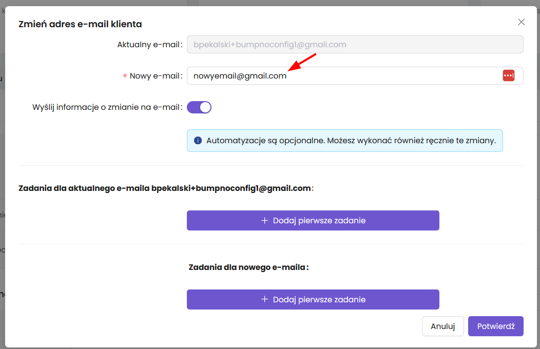 - Wyślij informacje o zmianie na e-mail – zaznacz, jeżeli chcesz, żeby klient otrzymał informacje na nowego maila o tym, że e-mail został zmieniony.