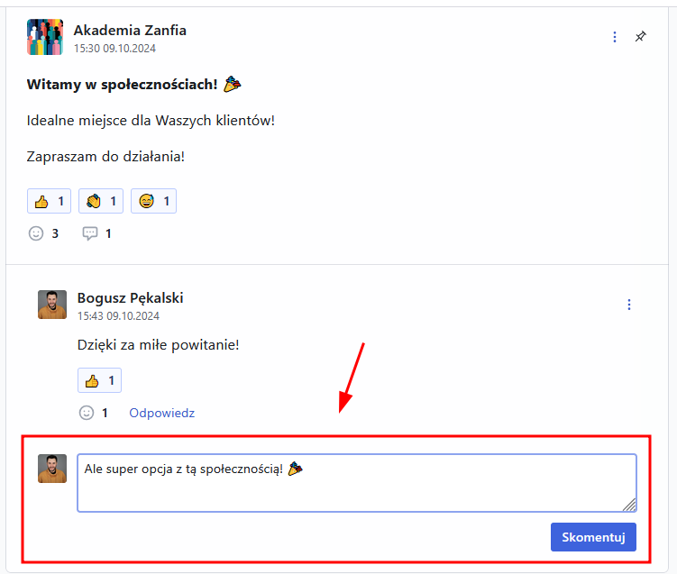 Aby dodać komentarz do posta rozwiń listę komentarzy, wpisz swój komentarz i kliknij „Skomentuj”.