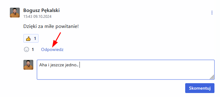 Jeżeli chcesz odpowiedzieć bezpośrednio na jakiś komentarz w dyskusji kliknij „Odpowiedz” pod wybranym komentarzem.