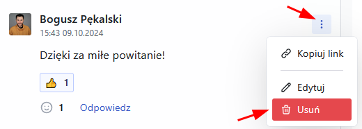 Aby usunąć komentarz kliknij ikonę kropek obok komentarza i wybierz „Usuń”.
