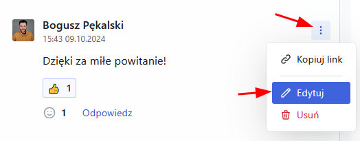 Aby edytować komentarz kliknij ikonę kropek obok komentarza i wybierz „Edytuj”.