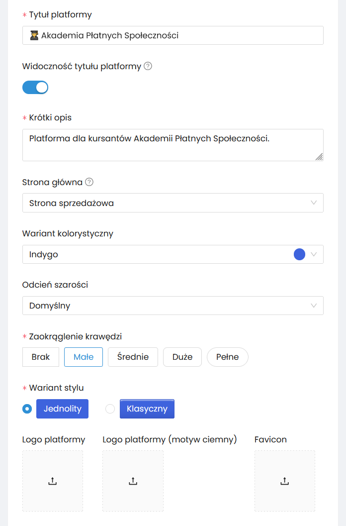 Widoczność tytułu platformy – opcja włączenia lub wyłączenia tekstowego tytułu platformy. Wyłącz tytuł platformy, jeżeli Twojego logo już zawiera nazwę.