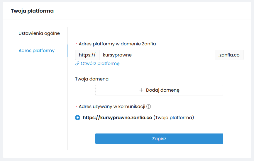 Przykładowo, jeżeli wpiszesz nazwę: kursyprawne to Twoja platforma będzie dostępna pod https://kursyprawne.zanfia.co.