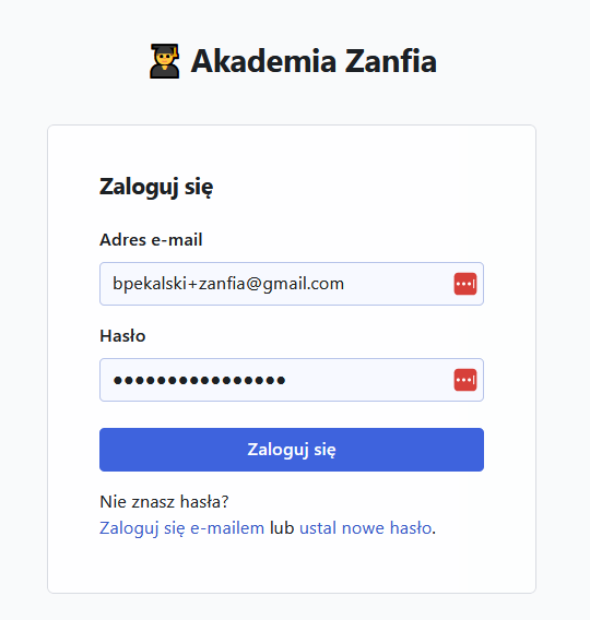 Zaloguj się za pomocą adresu email i hasła, którego używasz do logowania do Zanfii.