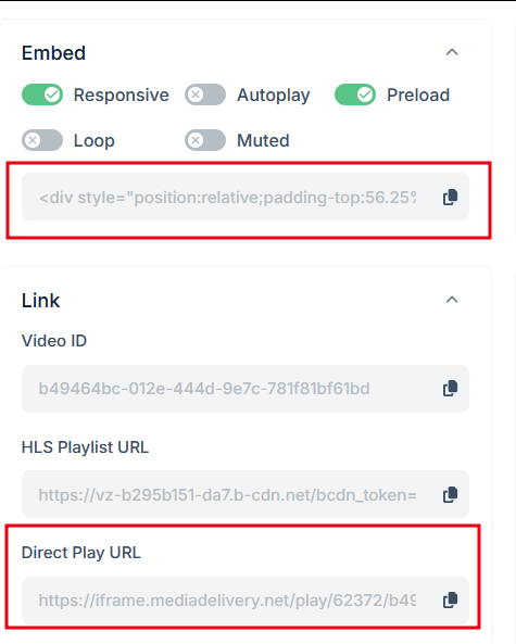 Uwaga: Dla Bunny.net obsługujemy również forma HLS (HLS Playlist URL), ale dla, żeby używać wszystkich opcji jak zapamiętywanie szybkości odtwarzania, napisów itd. rekomendujemy linki Direct Play URL lub link, który znajduje się w treści HTML w polu Embed zaczynający się od https://iframe.mediadelivery.net/.