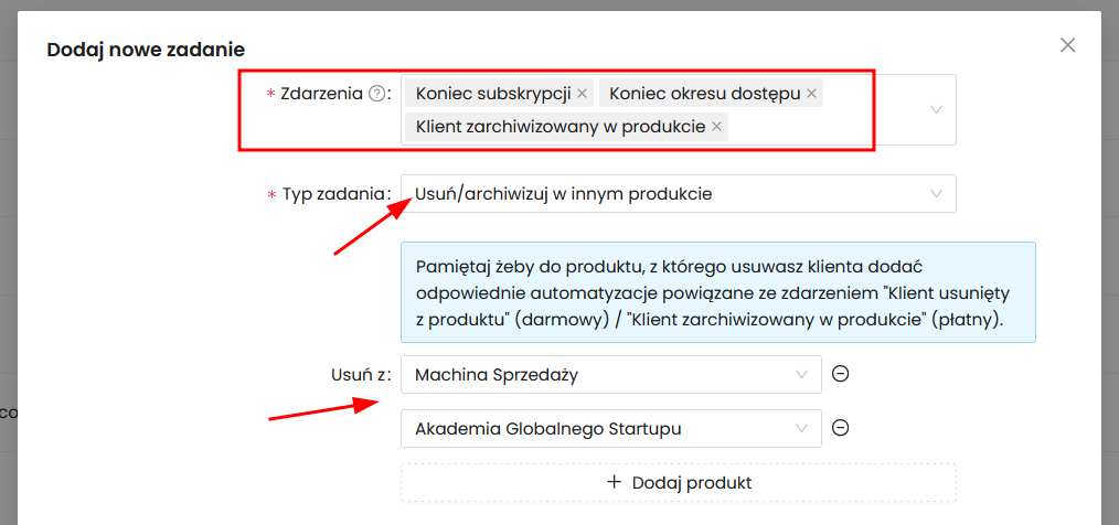 Dla produktów, które mają ograniczenie czasowe np. dostęp na rok dodaj również automatyzację, która usunie klienta z produktów w pakiecie na koniec okresu dostępu.
