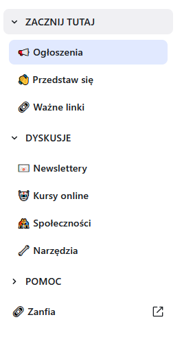 Z tego poziomu można przechodzić do kanałów w społeczności, zwijać i rozwijać grupy kanałów oraz przechodzić do własnych odnośników kierujących poza społeczność.