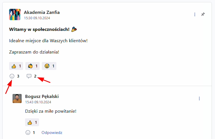 Pod postami znajdują się dodane komentarze oraz reakcje.