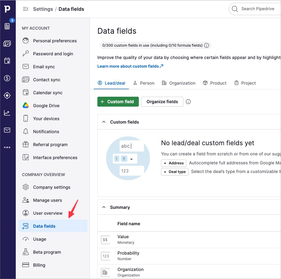 • Zakładka Person – pola MUSZĄ być utworzone w zakładce Person, nie Lead/deal czy Organization
