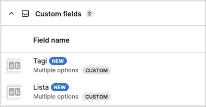 Po utworzeniu zobaczysz oba pola na liście z oznaczeniem CUSTOM i typem Multiple options.