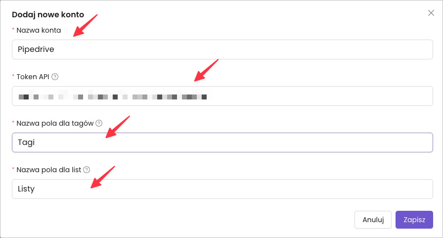 Integracja Zanfii z Pipedrive pozwala na połączenie obu systemów przy użyciu tokena API, dzięki czemu możesz dodawać kontakty i nadawać im tagi oraz dodawać ich do listy bezpośrednio z Zanfii.