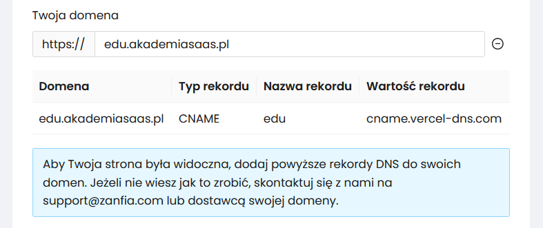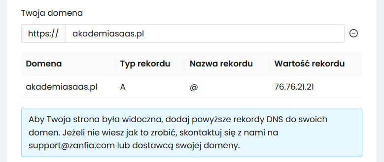 Możesz również skierować swoją główną domenę np. akademiasaas.pl na platformę Zanfia.