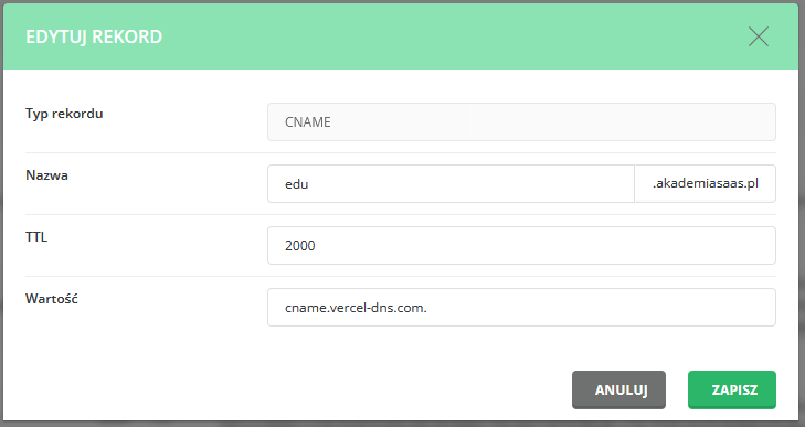UWAGA: Część dostawców hostingu wymaga umieszczenie kropki na końcu wartości rekordu CNAME.